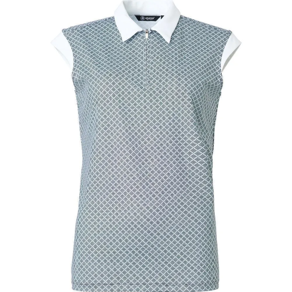 Lily sleeveless polo shirt is made of a very stretchy, lightweight fabric that also has drycool and wicking effects. With printed body and contrast collar. Zipper at neck opening and abacus logo at center back below neck. This top matches nicely with Lily and Megan’s skort.