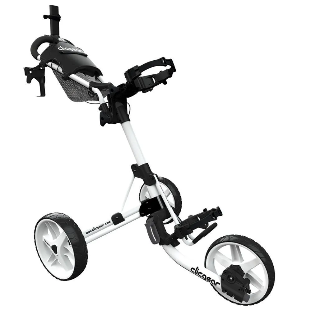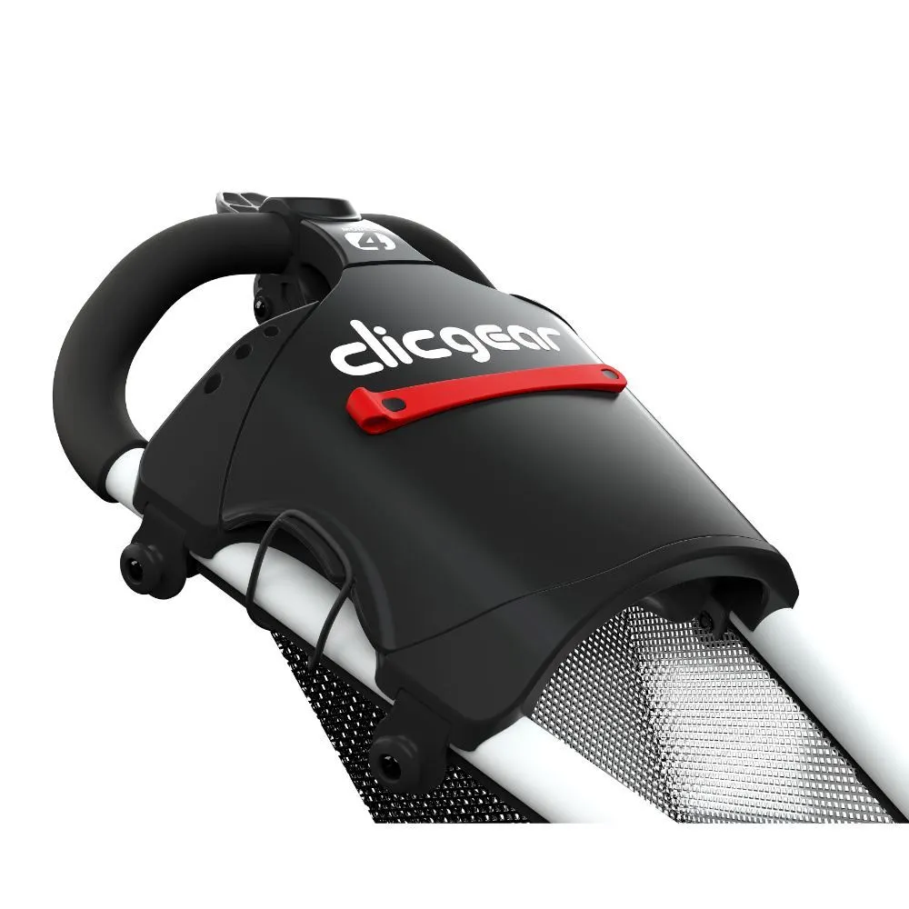 The Clicgear Model 4.0 is the latest update of our very successful three wheel golf pushcart design. We have added several improvements to the original design to make this the best model ever. These include New lid lock, adjustable upper saddle, silicone straps, adjustable front wheel, umbrella tube strap, improved scorecard & pencil holder The trolley still has all the improvements introduced in the Clicgear 3.5+ version, which are: Increased cargo net storage by 80% for even more room. Easy-Clip Bag Strap System that makes it easier to adjust and fit your bag on the cart, no matter the size or type of bag. Improved the umbrella storage clip to prevent any lost Umbrella Tubes. Redesigned Brake System with a new cable anchor pivot assembly that eliminates cable wear and damage. The brake gear and hammer profiles improved to engage better and reduce stress on the cable. Introduction of the Cup Holder Plus which was a more adjustable and lighter cup mount.