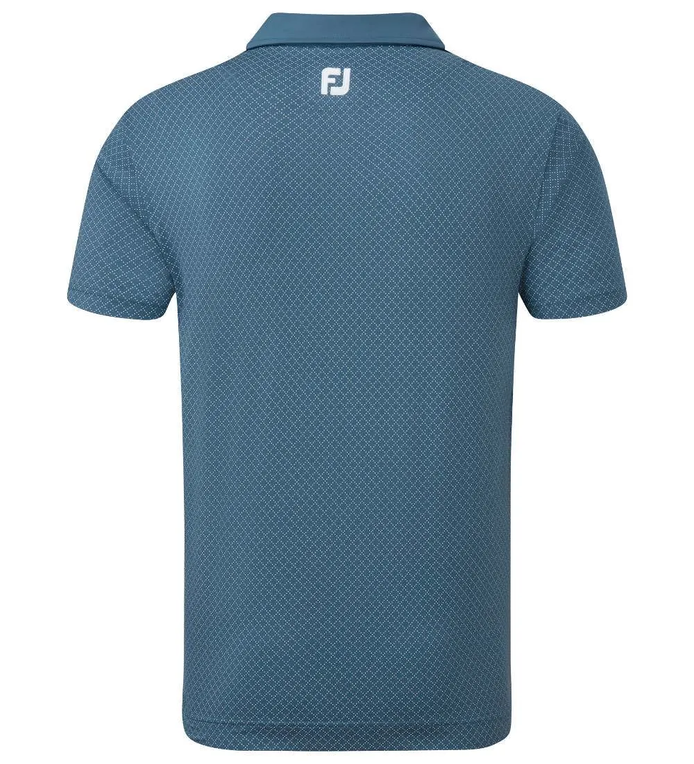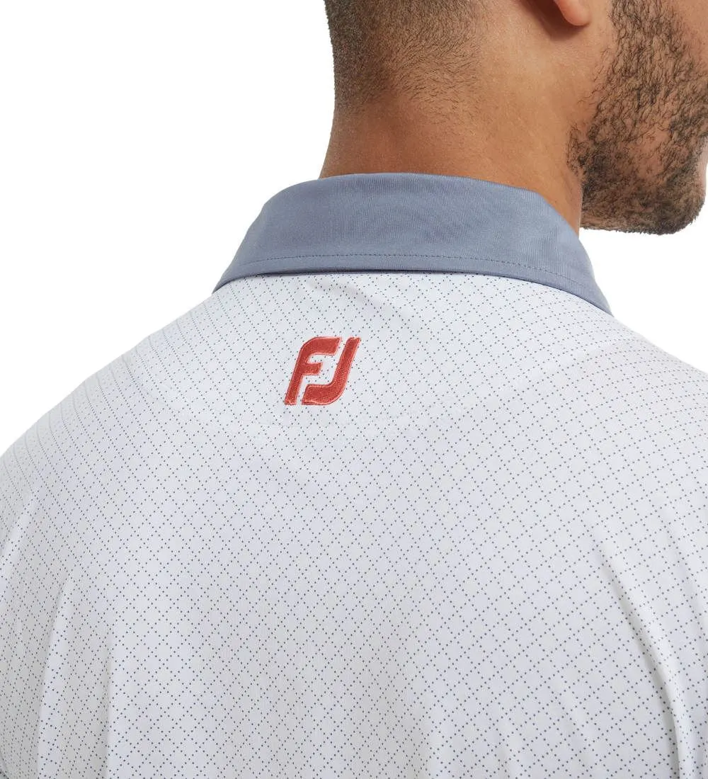 FJ ProDry Lightweight Stretch Lisle fabric. All over geometric dot print pattern. Solid colour collar and set on placket. Contrast collar and rear yoke FJ logo’s, with co-ordinated neck piping and button thread. Moisture wicking technology draws moisture away from the body. Easy care fabric to minimise wrinkling. SPF 30 UV protection